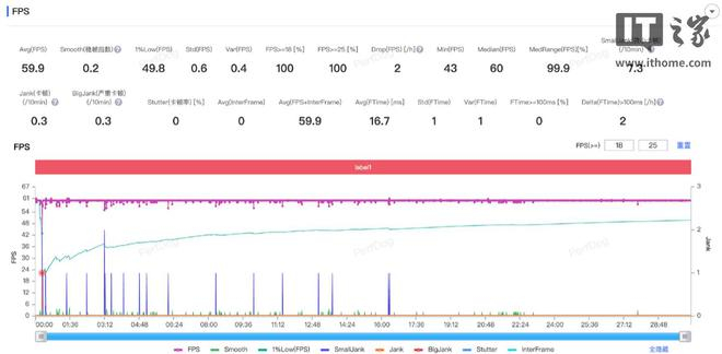 当然,这里也有测试条件的因素,比如 30 分钟的游戏中,只有 15 分钟保持在重负载。再一个则是这颗玄戒 O1 的最高主频为 3.4GHz,属于降频版的玄戒 O1。