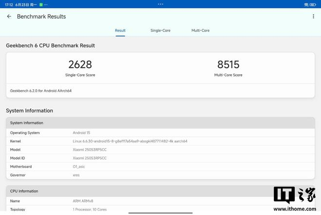 GeekBench 6 中,小米平板 7S Pro 单核 2628 分,多核 8515 分。