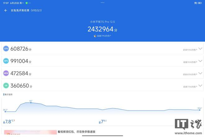 在常温环境下的测试(夏日空调室内 24°C 左右),小米平板 7S Pro 拿下了 2432964 分,其中 CPU 得到了 60 万 + 的分数,GPU 则为 99 万 + 分。