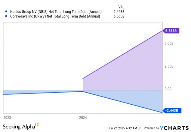 这种高杠杆扩张模式让CoreWeave快速获得大量GPU和收入,但也带来高度杠杆的资产负债表。相比之下,Nebius因出售Yandex俄罗斯资产获得54亿美元,起步时就拥有健康的现金储备和近乎零负债。Nebius更倾向于温和增长,依赖现金和小规模股权融资,而非大举举债。2025年第一季度,Nebius净现金为14亿美元,并于近期发行了10亿美元可转债以支持增长。