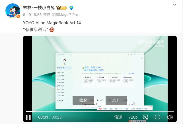 再此前,荣耀中国区副总裁、智慧生活全业务部部长 @林林-一枝小白兔 也在微博放出了使用荣耀 MagicBook Art 14 2025 进行 AI 智控的功能演示,可以直接搜索本地文件生成 PPT,非常方便。
