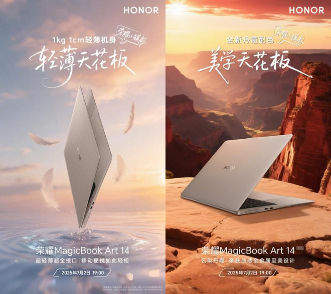 今天,荣耀正式官宣荣耀 MagicBook Art 14 2025 笔记本即将在 7 月 2 日发布,并曝光了这款笔记本的三大卖点:1kg、1cm 的超轻薄机身,1600nit 绿洲护眼屏,以及声控 YOYO 智能体功能。