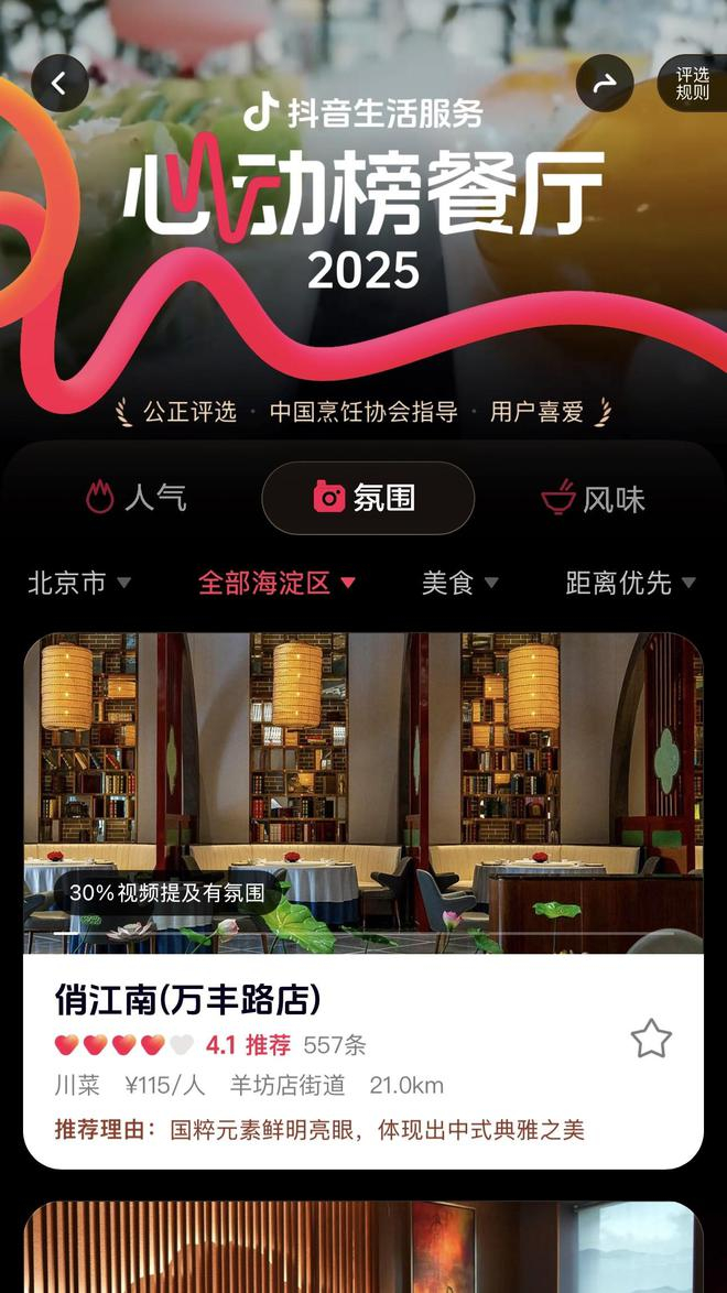 从4月15日抖音生活服务公布的2025年的“心动榜”餐厅上也能够看到,不少上榜餐厅也都不再单纯追求菜品升级,而是全方位打造能够触动消费者情感的“心动”,这种“心动”构成了独一无二的餐饮体验。在过去大热的六一、端午节和520情人节等“餐饮黄金档”中,这些心动榜上榜餐厅,也都获得了生意增长, 发榜一月内, 整体流量同比增长60%、交易同比增加75%。实现增长的秘密,就是制造并放大“心动感”——通过打造独特的“心动”感知,并通过抖音平台传播与放大。在这一过程之中,相对抽象的“体验经济”,也以更具像化的形式蔓延到餐桌上,进一步激发消费活力。