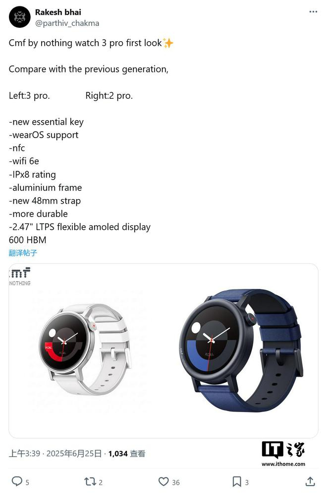 IT之家 6 月 25 日消息,消息源 @parthiv_chakma 今天(6 月 25 日)在 X 平台发布推文,分享了 Nothing CMF Watch Pro (3) 智能手表的渲染图,并透露了关键规格信息。