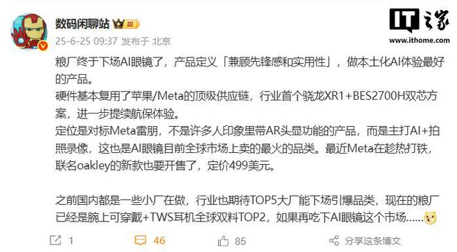 该博主还称,小米 AI 眼镜定位是对标 Meta 雷朋眼镜,不是许多人印象里带 AR 头显功能的产品,而是主打 AI + 拍照录像,这也是 AI 眼镜目前全球市场上卖得最火的品类。