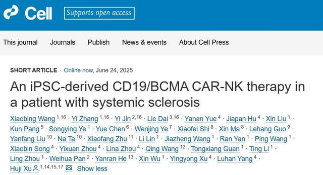 今天,徐沪济又一次在国际科学界闪耀——团队最新临床研究成果在国际三大顶尖学术期刊之一的《细胞》(Cell)以原创论著形式在线发表。这项研究不仅填补了CAR-NK疗法在硬皮病中的应用空白,更为“现货型、低毒性、广谱靶向”的自身免疫疾病精准治疗建立了新范式。值得一提的是,这也是继2024年7月《细胞》首次报道异体CAR-T治疗难治性复发性风湿病后,徐沪济教授团队连续两年在该刊发表突破性成果。