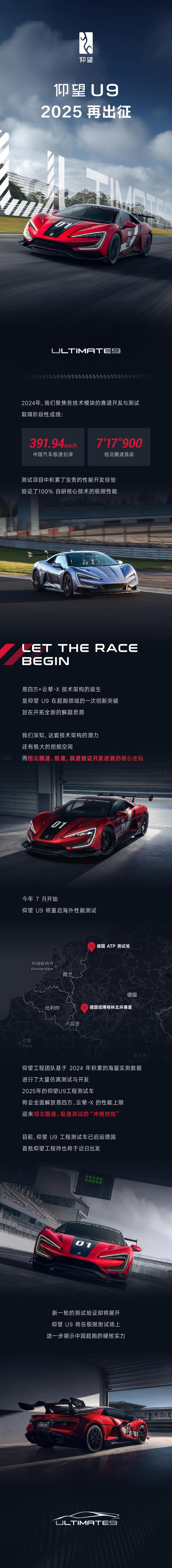 根据介绍,仰望 U9 去年取得了 391.94km/h 的中国汽车极速纪录,首次征战纽北取得 7 分 17 秒 900 圈速,今年 7 月将征战德国纽博格林北环赛道、德国 ATP 测试场。