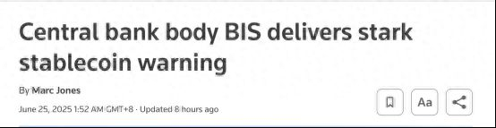 【环球网财经综合报道】据路透社等外媒,国际清算银行(BIS)在年度报告提前章节中发出警告,指出稳定币作为可靠货币形式存在显著不足,在缺乏监管的情况下可能对金融稳定和货币主权构成风险。