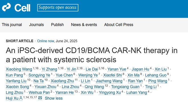 6月25日,澎湃新闻(www.thepaper.cn)记者从海军军医大学第二附属医院(上海长征医院)获悉,6月24日该院徐沪济教授团队最新临床研究成果“iPSC来源双靶点CAR-NK细胞在难治性系统性硬皮病中应用和机制研究”,在《细胞》以原创论著形式在线发表。