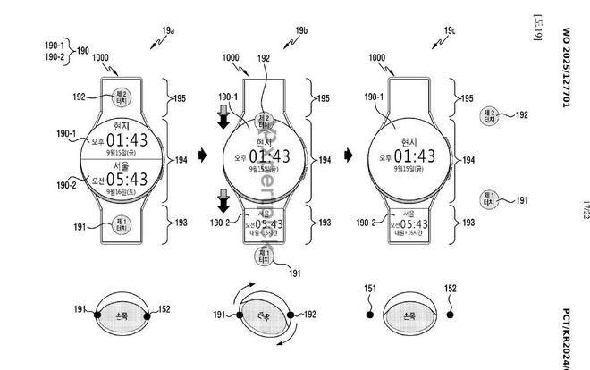 根据世界知识产权组织(WIPO)公示的专利,三星智能手表的表带部分,具有显示屏或触摸敏感区域。这些区域可能用于扩展用户界面元素、提供额外的控制,或者实现跨表盘和表带的触摸手势。