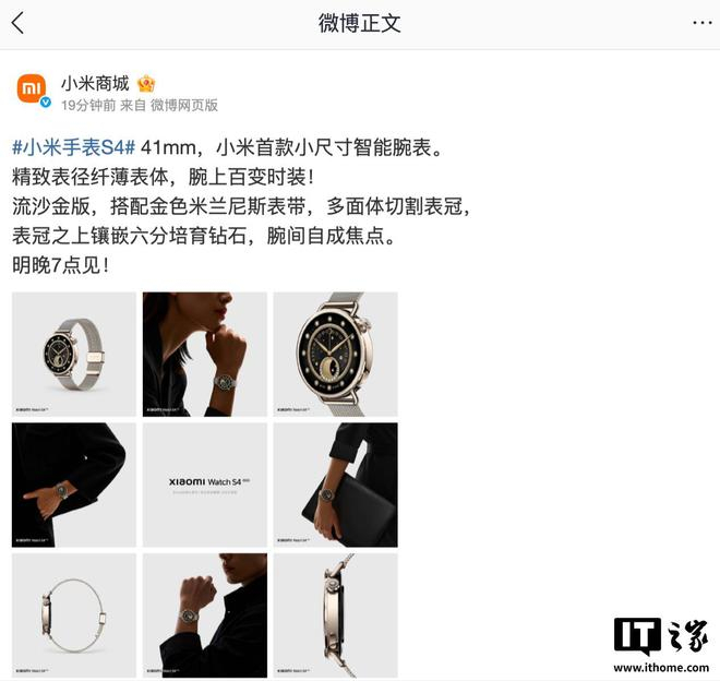 IT之家 6 月 25 日消息,小米商城今日于微博发文,宣布小米手表 S4 41mm 将于明晚 7 点发布,该手表的“流沙金”配色版本将在表冠之上镶嵌“六分培育钻石”。