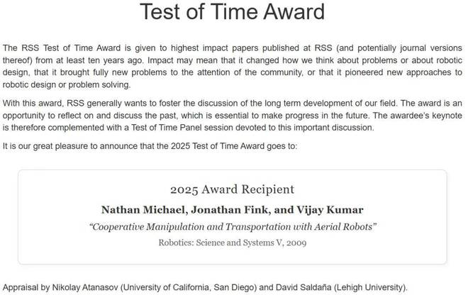 另外,RSS 2025 时间检验奖(Test of Time Award)论文也已经公布:Nathan Michael、Jonathan Fink 和 Vijay Kumar 于 2009 年发布的《Cooperative Manipulation and Transportation with Aerial Robots》。