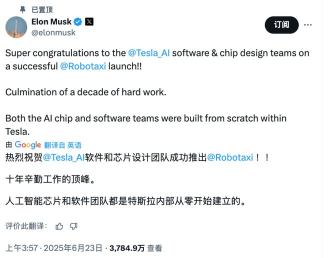 “热烈祝贺@Tesla_AI和芯片设计团队成功完成Robotaxi的落地!这是十年辛勤工作的顶峰。AI芯片和软件团队都是特斯拉内部从零开始创建的。”马斯克在X(原推特)上如是表示。