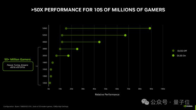 相比爆款RTX 3050,GeForce RTX 5050 GPU的光栅化性能(分辨率1080P)平均提升60%,在支持全套DLSS 4技术的游戏中,带来高达4倍的性能提升。