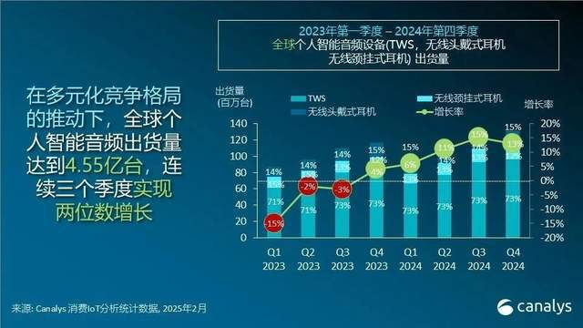 通勤的地铁上,点开喜欢的播客;周末家庭聚会,无线麦克风K个歌,更别提打工人随时随地打个语音电话、听觉障碍群体日常使用的助听器……这些都说明,音频的重要性在上升。Canalys的数据也显示,2024年全球个人智能音频设备(包括TWS、无线头戴式耳机和无线颈挂式耳机)的出货量达到4.55亿台,同比增长11.2%。