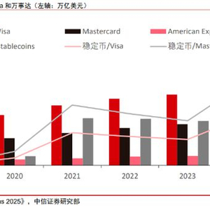 三是稳定币交易量的增长。中信证券研报显示,截至2024年末,全球稳定币总市值超2000亿美元。据ARK Invest统计,2024年稳定币交易额达15.6万亿美元,首次超过Visa和Master。