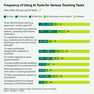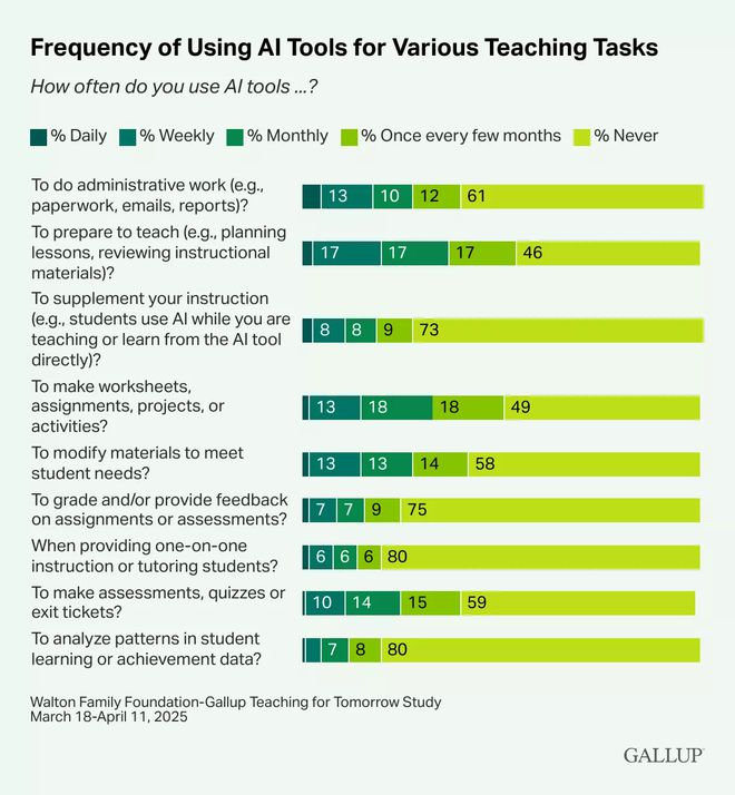 盖洛普最新的一项教师调查显示,在 2024 至 2025 学年,美国公立 K-12 学校中有六成教师使用过 AI 工具。最常见的用途包括备课、设计练习题,以及调整教学内容以更好地适应学生需求。