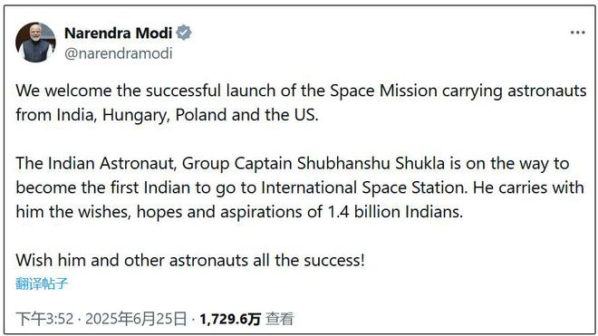 6月25日,印度总理莫迪通过社交平台“X”发文,祝贺印度宇航员时隔41年再次进入太空。