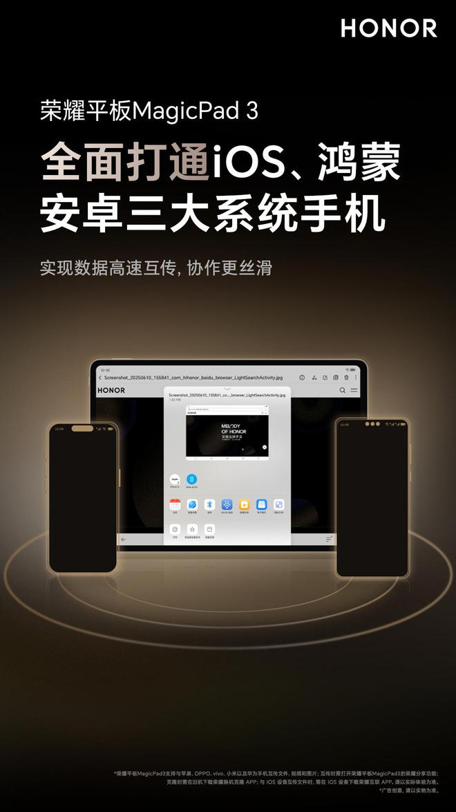荣耀 MagicPad3平板首次实现 iOS、鸿蒙、安卓三系统手机互联分享