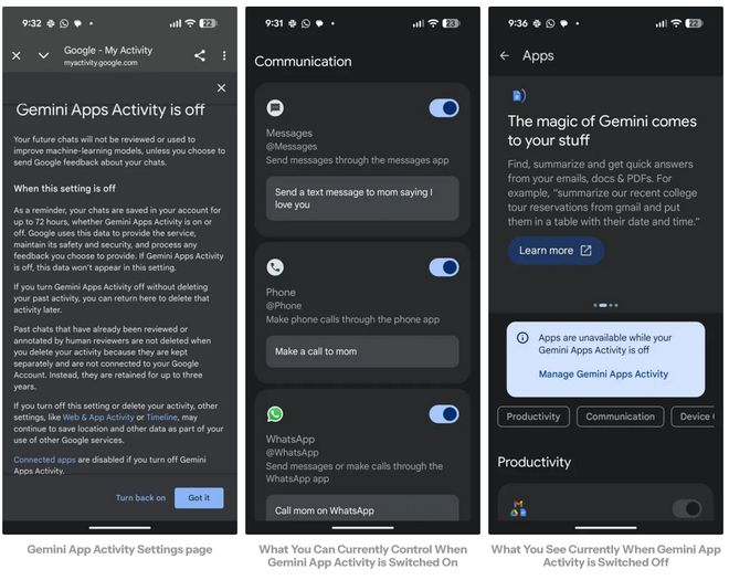 这意味着,从 7 月 7 日起,Gemini 即使在不启用应用活动选项的情况下,也能像个人助理一样工作。目前,如果用户的 Gemini 应用活动被关闭,与之关联的应用,如电话、WhatsApp、短信等也会被禁用。