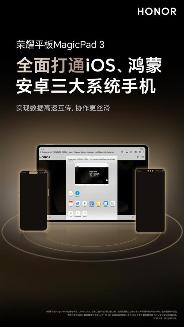 今日,荣耀手机官微发文,宣布荣耀MagicPad 3首次实现iOS、鸿蒙、安卓三系统手机互联分享,实现数据高速互传,协作更丝滑。