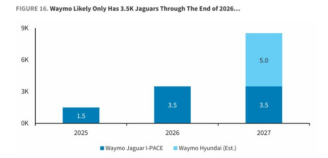 巴克莱指出,车辆供应是机器人出租车增长的最大瓶颈。Waymo目前的1500辆捷豹车队相比网约车平台上400万美国司机显得微不足道。Waymo计划在2026年增加2000辆捷豹I-PACE,但在2027年现代汽车加入生产前不会有额外车辆供应。