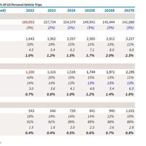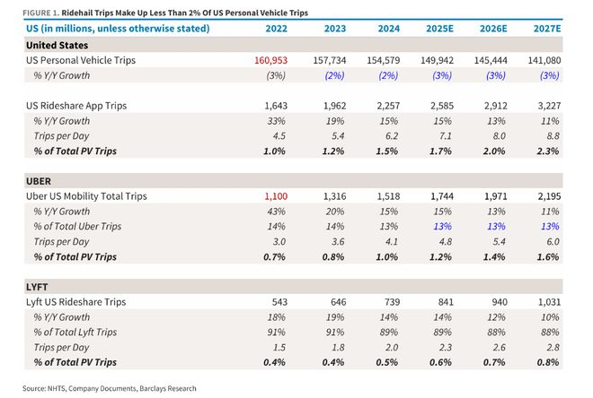 巴克莱研究数据显示,2026年美国个人车辆出行预计高达1454亿次,而网约车出行仅占29.1亿次。
