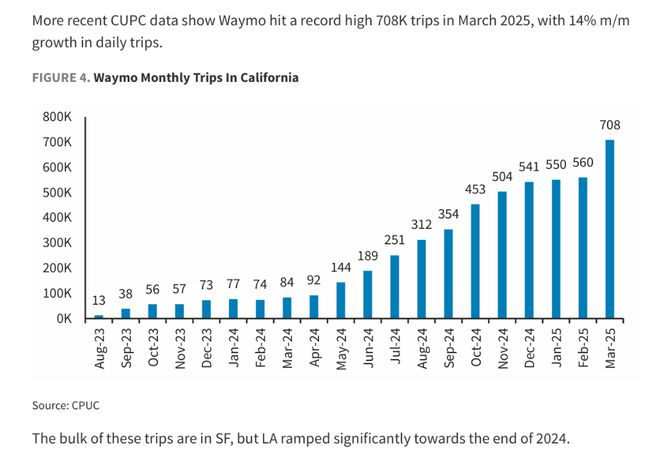 巴克莱的分析深入Waymo在加州的运营数据。Waymo目前在加州运营超过730辆捷豹I-PACE,约占其全球1500辆车队的一半。2025年3月,Waymo在加州创下70.8万次行程的月度新高,环比增长14%。车辆利用率也显著提升,截至2024年12月,平均每辆车每日完成约24次行程。