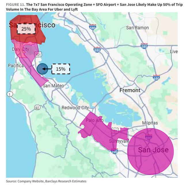 Robotaxi瞄准的市场并非全面铺开,而是高度集中的核心区域。以旧金山为例,市中心7×7英里的运营区域加上旧金山国际机场,占据了该地区总行程的40%。如果加上近期新增的郊区和圣何塞区域,Robotaxi可触达的市场约占Uber和Lyft当地总需求的50%-60%。