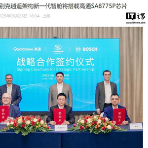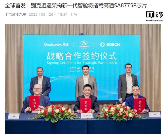 IT之家 6 月 26 日消息,上汽通用汽车今日宣布与高通、博世达成三方战略合作,共同庆祝全球首个基于高通 SA8775P 芯片开发的智能座舱域控制器样品成功下线。