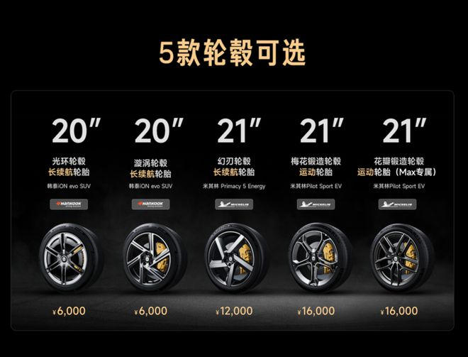 YU7 标配的是 19 寸的钻石长续航轮毂,同时也有 20 寸和 21 寸的各种轮毂以及悬浮车标可以选。