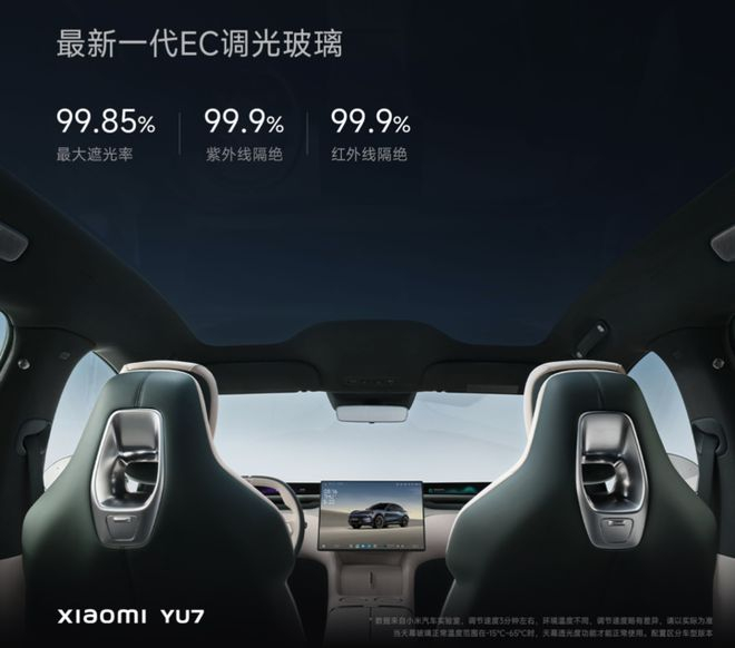 第一个是 YU7 全系标配了静音夹层玻璃以及全车做了 200 多处的噪音优化,在 30 多处关键部位都用了行业一流的隔音材料,第二个则是小米 YU7 配置了使用最新一代 EC 调光玻璃的全景天幕达到了物理遮阳帘的水平。