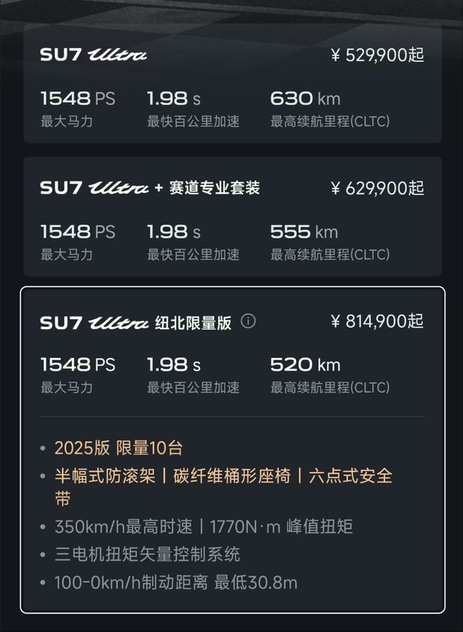 小米 SU7 Ultra 纽北特别版的定价为 81.49 万元,也可以在 SU7 Ultra 上单独选购 10 万元的赛道套装。