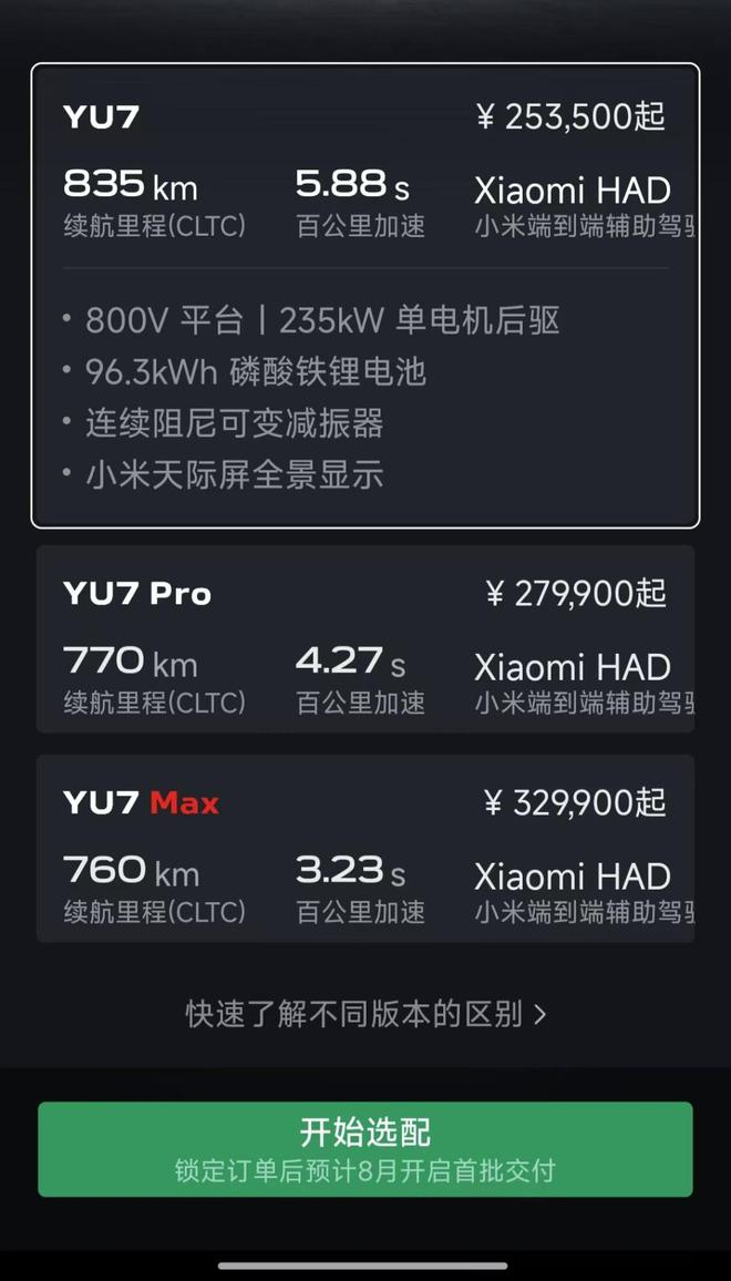 据小米汽车APP显示,除了首发YU7 Max现车版外,其他订单将于8月开启首批交付。