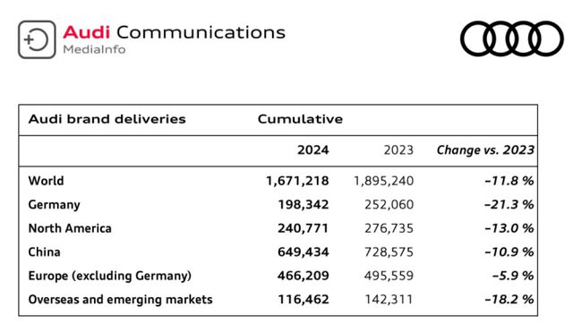 奥迪2024年总收入约645亿欧元,比前一年少了8%。