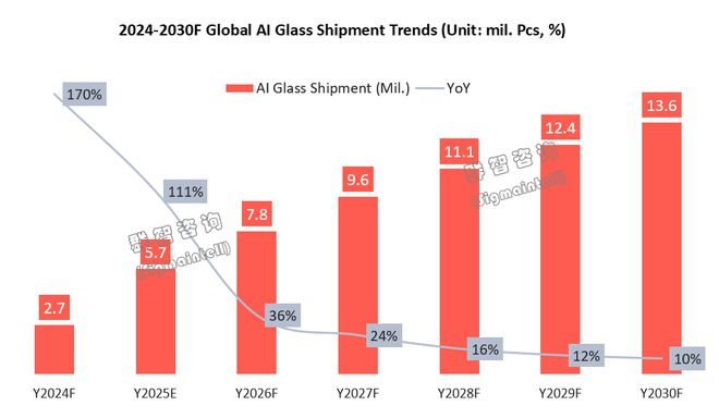 智通财经APP获悉,自Meta-Ray Ban引爆市场后,AI眼镜(区分AR/VR, 不具备显示功能但具备音频/拍摄的眼镜)成为了科技厂商纷纷涌入的新兴领域,今年年初举办的CES2025中掀起的”百镜大战”更是将AI眼镜的市场热度推到了一个新的高度。根据群智咨询(Sigmaintell)预测,2025年全球AI智能眼镜市场规模将达到570万台,同比增长高达110%,短期内快速增长的主要因素来自于消费者对新兴产品的尝鲜感,后续随着AI大模型和硬件配置的成熟以及生态建设的逐步完善,预计到2030年全球AI智能眼镜市场体量有望突破1360万台,未来5年复合增长率达19%。