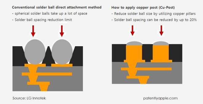 LG Innotek 预测这一趋势,于 2021 年开始研发下一代 Cu-Post 技术。与传统的直接使用焊球连接基板和主板的方法不同,Cu-Post 技术利用铜柱来减小焊球的间距和大小。