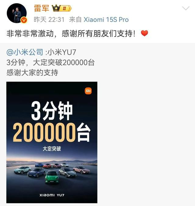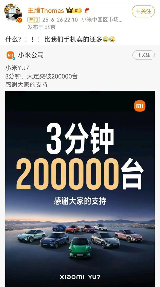 就在YU7发布当天,小米中国区市场部总经理、REDMI品牌总经理王腾还就“YU7三分钟大定突破20万台”发表评论称:“什么?比我们手机卖的还多”。