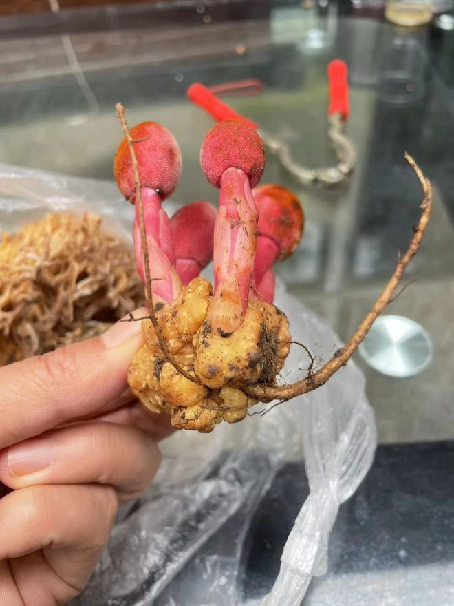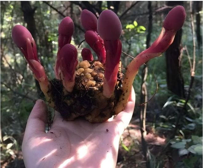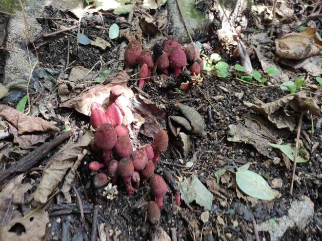 在热带或亚热带森林中,你偶尔会在某些植物的根部发现一种十分奇异罕见之物——大小、形状和蘑菇差不多,但是颜色却鲜红如血,它们成丛地生长在路边或者树下,十分显眼。很多人首次见到,都会把它当作蘑菇,其实它是一种全寄生的草本植物——蛇菰。