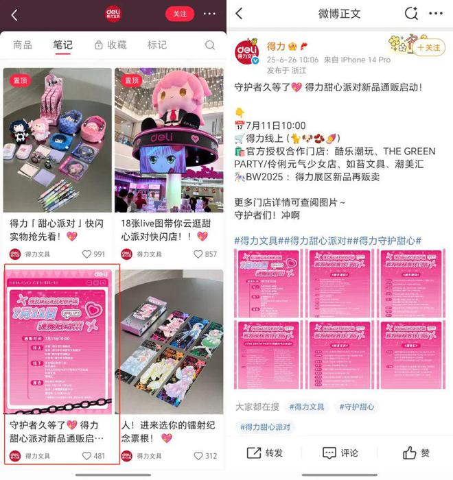 线下渠道全面开花,线上渠道得力也在积极营业。在其小红书和微博账号上,官方不遗余力地宣传其谷子产品,最新的一条动态中,得力已经开始为7月份的线下活动进行了预热。