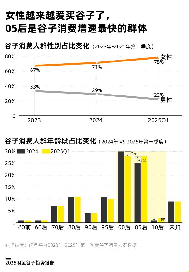 闲鱼和艾媒咨询今年发布的两个报告显示,谷子消费者的画像主要以00后和05后、女性、一线城市居民为主要群体。这类群体消费频次高、消费金额高。
