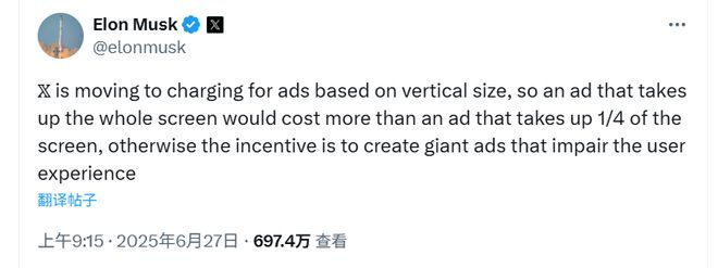财联社6月27日讯(编辑 周子意)根据埃隆·马斯克的最新发文,其社交媒体平台X将更改广告商的收费标准,按照广告的垂直尺寸收取费用。这标志着该平台的收入战略发生了重大转变,公司正努力将广告收入恢复到收购前的水平。