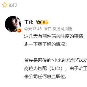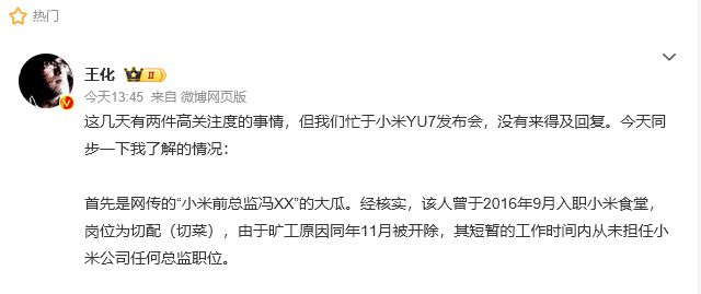 王化写道,“这几天有两件高关注度的事情,但我们忙于小米YU7发布会,没有来得及回复。今天同步一下我了解的情况:首先是网传的“小米前总监冯XX”的大瓜。经核实,该人曾于2016年9月入职小米食堂,岗位为切配(切菜),由于旷工原因同年11月被开除,其短暂的工作时间内从未担任小米公司任何总监职位。”