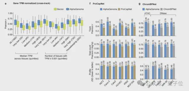 另外,AlphaGenome也在跨模态基因组轨道预测方面,都达到了最先进水平。
