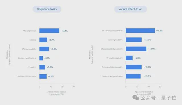 AlphaGenome在其中22项都保持领先,其中与另一种多模态序列模型Borzoi3相比,更是在细胞类型特异性的LFC预测上,表现出+17.4%的相对改进。