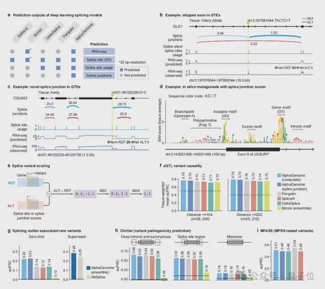 总之,AlphaGenome在7项基准测试中的6项上实现了最先进的剪接变异效应预测,为剪接事件改变和转录本结构提供了更全面的视图。