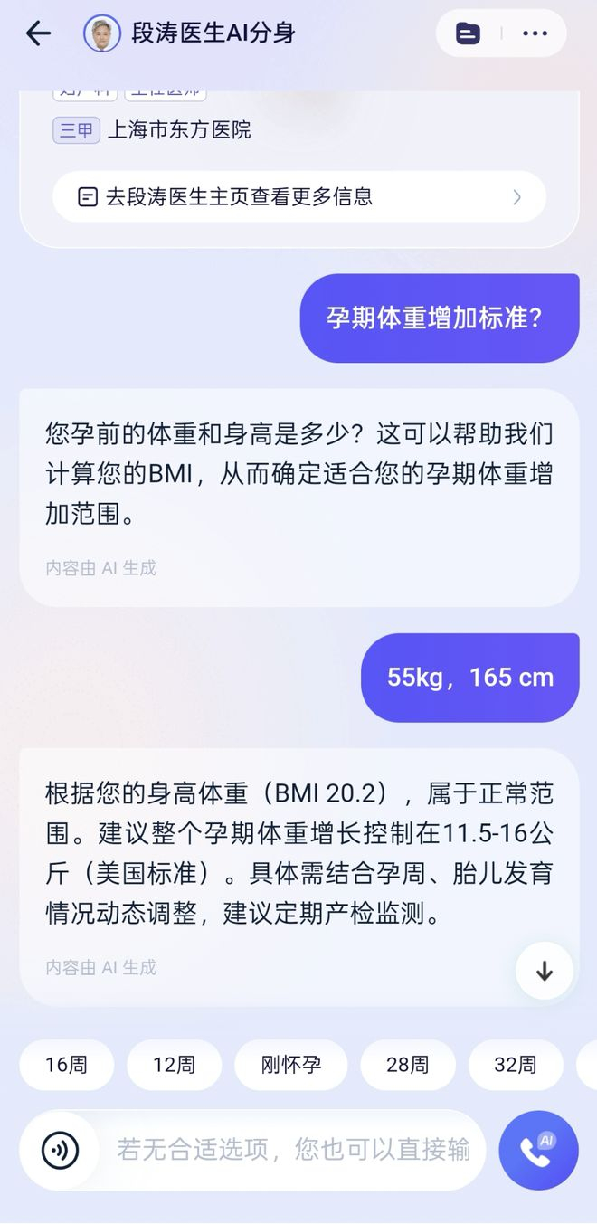 我试着咨询了一个关于孕期营养的问题,AI 分身不仅给出了专业的回答,它的问诊逻辑和语气,都像极了段涛医生本人。这并非简单的声音和形象授权,而是基于对医生大量结构化诊疗经验、科普文章和论文资料的深度学习,还会根据患者的问题给出更多问题,对症给出更准确的建议。比如,一个 AI 分身的诞生,需要「加训」超过 100 个小时的结构化诊疗数据和 5 万篇以上的专业资料。
