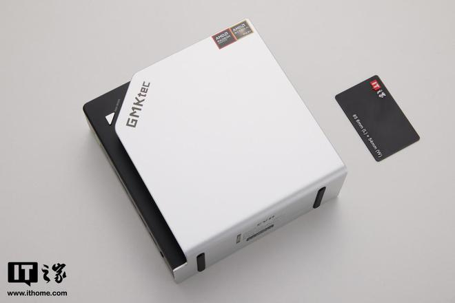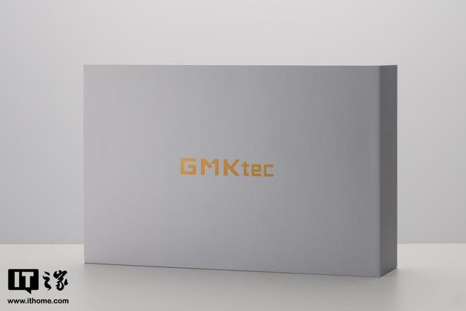 极摩客 X2 采用银白色的长方体包装盒,正面只有金色的“GMKtec”字样,看起来十分简洁利落。