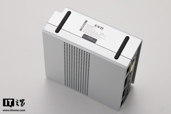 极摩客 EVO-X2 整体采用两个大小不一的扁平长方体重叠构成的视觉三明治设计,银色的再生铝金属盖板半包围式覆盖机身的顶部、底部和一个侧面。机身顶部平面的左下角还做了削边的设计,让整机看起来更有设计感和极客感。