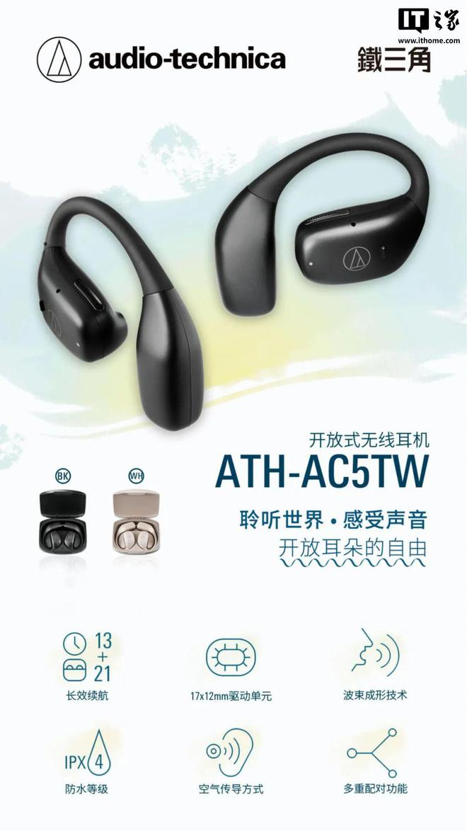 IT之家 6 月 27 日消息,铁三角今日在国内发布了ATH-AC5TW 开放式无线耳机,定价 799 元。